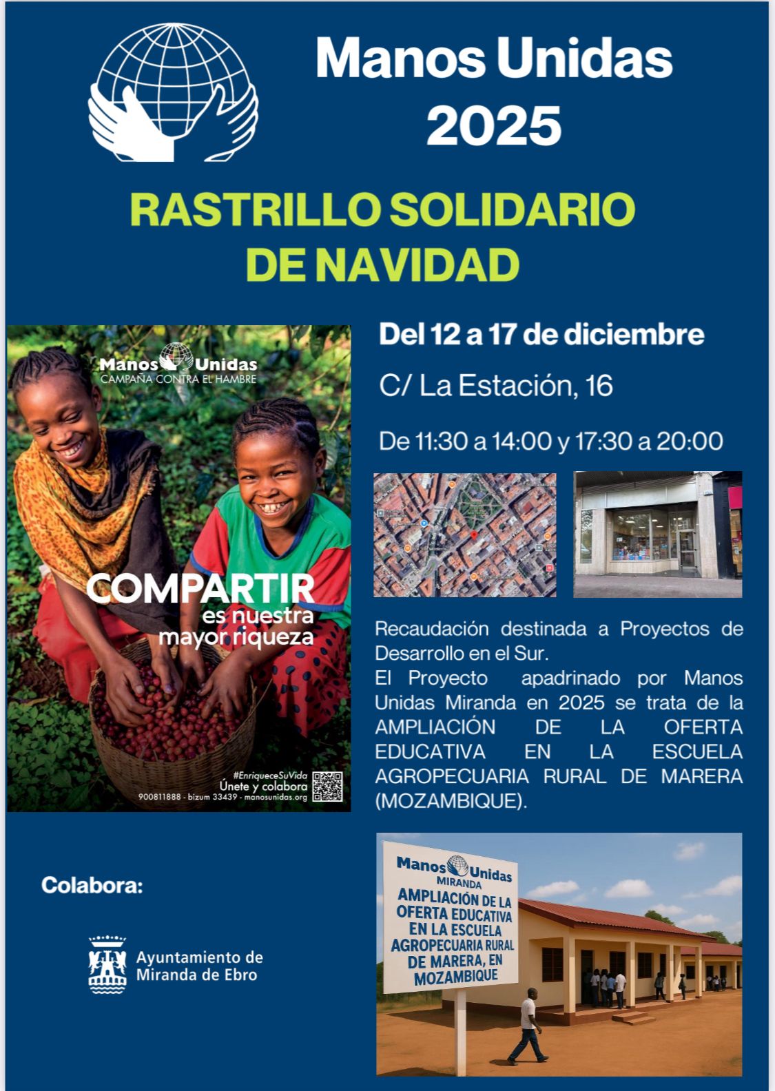 Del 12 al 17 de diciembre, Manos Unidas de Miranda de Ebro está celebrando su Rastrillo Solidario de Navidad, ubicado en la calle de La Estación, 16. Este Rastrillo es un evento clave para completar la financiación del proyecto que la organización está llevando a cabo en Mozambique: la ampliación de la oferta educativa en la escuela agropecuaria rural de Marera.